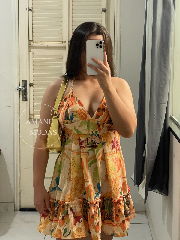 O design moderno conta com detalhes de amarração nas costas e no pescoço, adicionando um toque delicado e ajustável ao look. O comprimento curto aliado à barra levemente rodada garante movimento e fluidez, deixando a produção ainda mais charmosa e feminina.